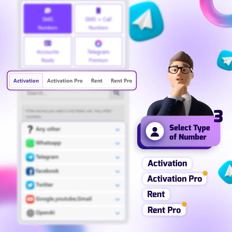 Choose which service you want to use your number on (such as: Telegram or WhatsApp or Facebook, etc.) If the service you want is not in the list, use the "any other" option.